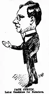 He wrote for radical and socialist newspapers.[22] From 1911 until 1915, Curtin was employed as state secretary of the Timberworkers' Union. He was elected federal president of the union in 1914. During World War I he was a militant anti-conscriptionist; he was briefly imprisoned in December 1916 for refusing to attend a compulsory medical examination,[23] even though he knew he would fail the exam due to his very poor eyesight.[24] He also stood (unsuccessfully) as the Labor candidate for Balaclava in the 1914 federal election.[25][26] The strain of this period led him to drink heavily and regularly, a vice which blighted his career for many years.[27] He proposed to Elsie Needham on St Kilda Beach,[24] and they were married on 21 April 1917 in the dining room of a private home in West Leederville.[28][29]