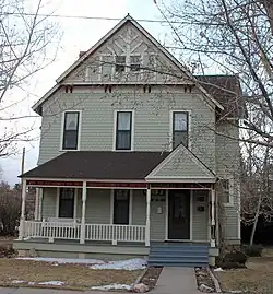 The two-story wood-frame Victorian style house is about 31 feet (9.4 m) wide and 45 feet (14 m) deep. It has three porches and detailing resembling half-timbering at the attic level. There are four main rooms downstairs and five bedrooms upstairs.[2]