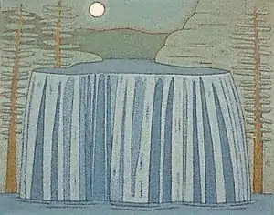 By 2006, Dilg committed to a spare landscape mode that New York Times critic Roberta Smith later termed "cartoon-visionary."[16][7][40] In these small-scale paintings, he engages his subject less as historically specific sites than as stylized, general signs that metaphorically record and convey his relationship with the land.[16][7][2] They bring together diverse sources and precedents in a singular, personal vision—among them, 19th-century chromolithography, Japanese woodcuts, Early Renaissance landscapes, self-taught art, vintage postcards and game boards, thrift-store paint-by-number paintings and handmade signs.[1][7][41][42] Dilg's interest in tourist and folk-art sources stems from a desire to recover the immediacy, sense of wonder and discovery, and uncanniness of such imagery—qualities often trained out of professional artists.[8][36] His carefully selected and composed pictorial elements often tap into the power of primal subjects: waterfalls and gorges (e.g., On Another Planet, 2012), towering sequoia forests and evergreens, and formations like Yosemite's Half Dome that evoke the American West of 19th-century artists like Albert Bierstadt and Thomas Moran, as well as the Gothic, moonlit landscapes of German Romantics, such as Caspar David Friedrich.[8][43][42][44]