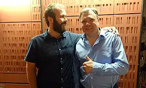 Finnemore (left) with Ed Balls at BBC Radio Four in 2017