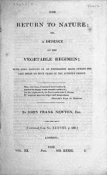 - ↑ Newton, John Frank. (1821). The Return to Nature: Or, A Defence of the Vegetable Regimen. London. pp. 113-114