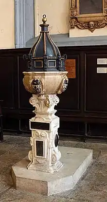 He instituted the annual Lion sermon at St Katharine Cree Church, Leadenhall Street, London. The sermon was inspired by his time in the Syrian Desert, when a lion passed him by without attacking him, leading him to believe that he had had a miraculous deliverance.[4][5] The sermon has traditionally been preached on the theme of 'challenges to the Christian faith'.[6] Gayer endowed St Katharine Cree with a fund to preach the sermon, gave money to charities, and bought a baptismal font for the church inscribed with his coat of arms.[5]