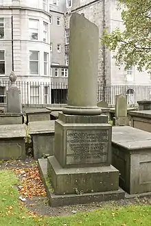 His wife, Katherine Easton, died on 20 February 1845.[10] John Gibb died on 3 December 1850.[2] They are buried in the churchyard of the Kirk of St Nicholas. The grave lies in the eastern section of the main area south of the church.