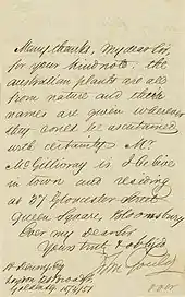 Even after leaving Australia, John Gould corresponded with many scientists and collectors in the colonies, including Frederick McCoy, who was the director of the National Museum of Victoria from 1857 to 1899. These letters detail the sale of specimens, including mammals, insects, shells, and bird skins for the museum's collections, and copies of Gould's scientific publications for the museum library. Gould insisted that any species of birds that were at that time new to Western science be forwarded to him in London to be described and figured.[18]