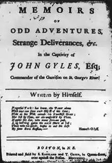 In 1736 Gyles published his memoirs of his adventures.[4] First printed in Boston in 1736, it was reprinted in 1853 and in 1875, and used as the basis for a modern adaptation of the memoirs by Stuart Trueman in 1966.[1]