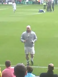 Hartson made his debut for West Ham on 15 February 1997 alongside another new signing, Paul Kitson. West Ham lost 1–0 to Derby County and Hartson was booked.[11] His first West Ham goal came in his next following game on 24 February 1997, a 4–3 home win over Tottenham Hotspur.[12] In his first season, he scored five league goals from eleven games and was instrumental in helping West Ham rise from 18th when he joined to a final league position for 1996–97 season of 14th.[13] The next season saw Hartson finish, with 24 goals in 42 games in all competitions, as West Ham's top scorer. Hartson's goal tally was in all a considerable margin ahead of the next highest scorer, Eyal Berkovic with nine goals.[14] He was also the second highest scorer, behind Andy Cole in the Premier League in that season. In the 1998 close season, Manchester United chairman Martin Edwards and assistant manager Brian Kidd expressed their desire for Hartson to sign for Manchester United to manager Alex Ferguson. However, Ferguson decided against making a bid for Hartson.[15] In a training ground incident in September 1998, Hartson kicked West Ham teammate Eyal Berkovic in the face, after the Israeli midfielder had punched Hartson in the leg as he attempted to help Berkovic to his feet. The incident was captured on camera. Hartson was fined and admitted in his biography that it was an error of judgement.[16] Berkovic said of the incident "If my head had been a ball, it would have been in the top corner of the net".[17]