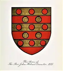 Caunter was Domestic Chaplain to the Earl of Thanet.[25][26] He bore arms Barry of six, or and gules, thirteen bezants counter-changed 3, 2, 3, 2, 3. His crest was a naked arm erect, couped at the elbow holding a branch ppr. His motto was "Quam non torret hyems" ("Which winter does not nip with cold", referring to the branch which forms part of the crest).[27][28][29]