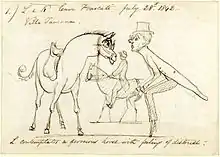 - Charles Allanson Knight (1814–1879) who married Jessie Ramsay (1828–1922), daughter of William Ramsay (1800–1881) (alias Innes) of Barra, Inverurie, and widow of Count Alexander de Polignac(d.pre-1862).[19] He was a friend and contemporary of the writer and artist Edward Lear (1812-1888), with whom in 1842 he made a tour of the Abruzzi. Having given him riding lessons "round the walls of Rome", he lent the artist one of his horses for the journey, an Arab named Gridiron.[20] Lear made several drawings during the journey which "make fun of his poor horsemanship, with typical self-deprecating humour" and "record the pair's adventures in comic form".[21][22] Lear described the journey in his Illustrated Excursions in Italy, Vol.1, 1846, in which he refers to Knight as "CK".[23] Lear "remembered their adventures for the rest of his life and on his deathbed he lay dreaming of the ride around Rome".[24]