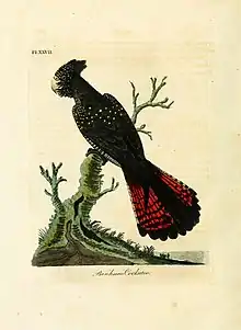 Drawing of the red-tailed black cockatoo, a color plate from A General Synopsis of Birds (vol. 2, 1822)