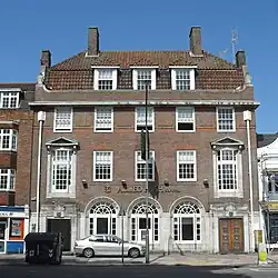 Now the All Bar One bar and previously used by Royal Insurance,[6] this "very stylish and well-detailed" Neo-Georgian brick building was originally the head office of a local newspaper. It has a bow-fronted arcade of sash windows. Joseph Cribb was responsible for its carved Portland stone capitals depicting scallops and seahorses.[1][6][24][51]