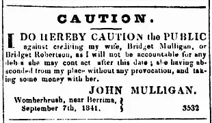 - ↑ Caution, Sydney Gazette and New South Wales Advertiser, 9 September 1841, page 3.