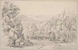 After leaving Mulligan's Lynch paid a surreptitious visit to the 'Oldbury Estate', where he had previously been assigned, now under the possession of Thomas Humphrey.[23] At ‘Oldbury’ Lynch stole eight bullocks from a paddock and began to drive them towards Sydney, with the intention of selling them. When he got to the Razorback Range, between Stonequarry and Camden, he met with a carrier named Edmund Ireland (a ticket-of-leave holder) and his helper, an Aboriginal boy. Ireland was in charge of a dray, "laden with produce", and its team of bullocks, which were owned by the pastoralist, Thomas Cowper.[24][25] At this point, according to Lynch's later confession, "he began to form the plan of destroying the men, and possessing himself of the dray and property". The following morning Lynch firstly killed the boy, and then Ireland, each of them by the blow of a tomahawk on the back of the head. He dragged the bodies about a hundred yards into the bush and put them in a rocky cleft and covered the bodies with stones.[21][26]