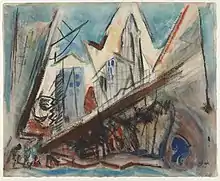 John Marin was among the first American artists to make abstract paintings.[10] Marin is often credited with influencing the Abstract Expressionists. His treatment of paint—handling oils almost like watercolors—his forays into abstraction, and his use of evocative stretches of bare canvas caught the eye of younger painters.[11] His experience with architecture might have contributed to the role played by architectural themes in his paintings and watercolors.