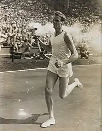In late 1947, he was already on the British shortlist for selection for the 400 metres at the forthcoming London Olympics, when his Olympian good looks led to his being chosen to light the Olympic flame at the opening of the games. Thus on 29 July 1948 he carried the heavy Olympic torch on the final leg of its journey into Wembley Stadium and lit the flame in its specially-designed bowl.[1]