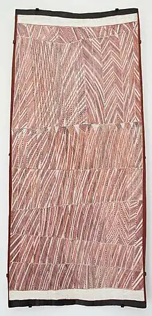 His work was subsequently the subject of a major retrospective in Basel, Switzerland (2005) and in the Sprengel Museum in Hanover, Germany (2006). In 2018–2019 an exhibition of his work was shown in the Museum of Contemporary Art Australia and afterwards as part of Tarnanthi 2018 at the Art Gallery of South Australia. The John Mawurndjul exhibition at the Museum of Contemporary Art showcases a collection of bark paintings from one of the leading custodians of the land in Australia. The exhibition highlights Mawurndjul's spiritual heritage, which is reflected in his art, and the paradox of bark painting as both an ancient and new form of artistic expression.[19] The exhibition is arranged according to the moiety, the two ritual groups that divide a people, and the artist's request to not hang works in chronological order reflects the Indigenous sense of time. The exhibition showcases Mawurndjul's large-scale bark paintings, which he began making in the late 1980s after a dream and inspired by visits to art museums.[19] This exhibition showcased places of special cultural significance called kunred, along with the sacred places, spirits, and various animals that are integral to his artwork, has been developed under the leadership of the artist himself, and is described in both Kuninjku and English.[20] This was the first major exhibition of his work in Australia.[21] This made Mawurndjul the first Australian artist to have recceived a retrospective at two foremost museums in Europe.[10]