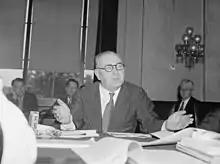 As administrator of the FWA, Carmody appeared before a Senate committee on July 13, 1939, where he promised to the "Senate Banking and Currency Committee that the new $350,000,000 public works program would not interfere with private industry. He pointed out that President Roosevelt's program made no specific provisions for federal loans to municipalities for acquisition of private utilities."[5]