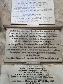 Under this place are deposited the remains of John Moutray Esq of Roscobie in Fifeshire in the Kingdom of Scotland twenty eight years a post captain and late a Commissioner of His Majesty's Navy in Antigua. In his public character he was valuable to his country for his long and faithful services and universally beloved for the integrity of his principles and the distinguished sincerity of his heart. He died 22 Nov 1785 in the 63rd year of his age".[9]