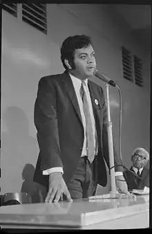 In 1972, Newfong was made the "chief spokesperson" for the Aboriginal Tent Embassy on the lawns of Old Parliament House in Canberra, where his media contacts and experience in the Canberra press corps were crucial in establishing a public image for the embassy.[3] His political allies here included Gary Foley, Charles Perkins, Paul Coe, Isabel Coe, Gordon Briscoe and Chicka Dixon.[2] Although he resided at the embassy, which was established as a land rights protest, from February until July and was quoted frequently in The Australian and overseas press, he is best remembered for his quote, "The Mission has come to town".[1]