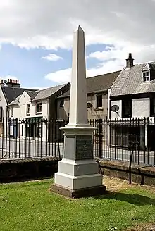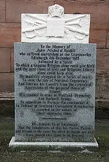 Nisbet was eventually captured at Fenwick and following trial was executed in the Grassmarket in Edinburgh on 4 December 1685 by hanging.[17] Nisbet is buried at Greyfriars Kirkyard in Edinburgh, and there is a memorial monument at Loudoun Parish Kirk in Newmilns.