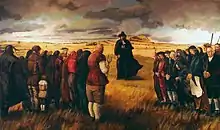 After the Restoration he took an active and prominent part in the struggles of the covenanters for religious and civil liberty. He refused to countenance the curates, and attended the ministrations of the ‘outed’ ministers, renewed the covenants at Lanark in 1666, and was one of the small band who published the declarations of the Societies at Rutherglen, Glasgow, and Sanquhar. He fought at Rullion Green (28 Nov. 1666) till, covered with wounds, he fell down and was stripped and left for dead upon the field. At nightfall, however, he crept away unobserved, and lived to take part in the engagements at Drumclog (1 June 1679) and Bothwell Brig (22 June), where he held the rank of captain. For this he was denounced as a rebel and forfeited, three thousand merks (£165 sterling) being offered for his head.[6] On 16 April 1685, Nisbet and Alexander Peden was almost captured in Nisbet's house.[13] In November 1685 he was surprised, with three others, at a place called Midland, in the parish of Fenwick, Ayrshire, his captor being a cousin of his own, Lieutenant Robert Nisbet.[14][15] His companions were instantly shot, but for the sake of the reward he was spared, and, being brought to Edinburgh, was tried[16] and condemned to death.[6]