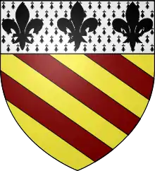 John Norman's coat of arms appear illustrated in the portrait (pictured right) painted by Roger Leigh who lived around 1450.[1] They (pictured above left) are recorded in the Harleian Mss., number 2169 on folio 65; and are blazoned: Or, three bendlets gules, a chief per fess argent and ermine, charged in chief with three fleurs de lys sable.[9] In the mid 19th century, Burke however gave a different blazon which omits the ermine: Or, three bars gules on a chief argent as many fleurs de lis sable.[13]