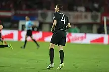 O'Shea was scheduled to face Spain on 11 June 2013 at Yankee Stadium in New York, but was ruled out of the game over the sudden death of his uncle Jimmy O'Leary.[44] On 14 October 2014, on his 100th cap, O'Shea scored the equalising goal with the last kick of the match, in a 1–1 draw against Germany at Gelsenkirchen, in a UEFA Euro 2016 qualifying match.[45] In the final qualifier, a 2–1 defeat away to Poland on 11 October 2015, he was sent off for a foul on Robert Lewandowski and thus missed the first leg of the Republic's play-off.[46]