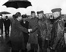 Coursey (second from right) shakes hand with Japanese officials at Iwakuni Air Station, April 1965. Major general Paul J. Fontana is third from right.