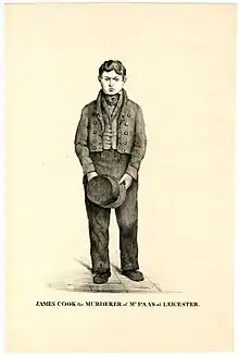 John Paas (name used legally) was murdered in Leicester by James Cook, in a criminal case that attracted wide attention. He was aged 49, a partner in the firm Paas & Co. of High Holborn, London, engravers. He was in Leicester as a travelling salesman of specialist hardware.[3] Cook, a printer and bookbinder, was exhibited on a gibbet after being hanged, the last British criminal to be so treated.[4]