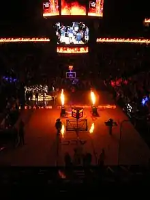 The University of Virginia opened the John Paul Jones Arena on November 12, 2006, with a pair of victories. The Virginia women's basketball team defeated Old Dominion University 92–72 in the afternoon. Later that evening in front of a capacity crowd of 15,219, the Virginia men's basketball team defeated No. 10 ranked Arizona 93–90, rallying from a 19-point first-half deficit. Both games included elaborate pre-game festivities that featured a fireworks display and the Cavalier mascot rappelling from the rafters. Michael Buffer was introduced to announce the Virginia starting lineup prior to the men's game.