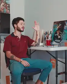 John Reno Jackson was born in George Town, Cayman Islands in 1995. His father from Cayman Brac and his mother from Texas, Jackson spent his younger years primarily in the Cayman Islands, and at times south Texas and Europe, developing his technique and exploring concepts around identity.[1] Jackson attended foundation courses in painting and drawing at the Art Academy London in 2015.[2] Upon his return to Cayman, Jackson continued evolving his practice through residencies and educational programs. In 2020, Jackson was accepted into the TURPS Correspondence Course. An art school programme by TURPS Banana aimed towards painters who want to develop or invigorate their work through mentorship.[3]