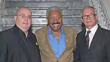 John Rivas, Rafael Ithier (from El Gran Combo de PR), and Miguel Muñoz (President of the University of Puerto Rico) at "The Art of BONZZO Visits the General Archive of Puerto Rico - Big Comic Strips Expo".