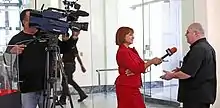 Luz Nereida Vélez, from Noticentro 4, interviews John Rivas at "The Art of BONZZO Visits the General Archive of Puerto Rico - Big Comic Strips Expo".