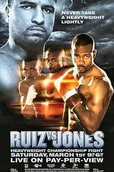Late in 2002 Jones, who had already been a world champion at middleweight and super middleweight in addition to his light heavyweight title reign, announce he was going to move up to the heavyweight division to challenge Ruiz for the WBA championship.[1] Jones had become a star in the light heavyweight division and at the time of his match with Ruiz, held titles from seven different boxing organizations. Ruiz's promoter Don King had spent much of 2002 negotiating with Jones in an effort to get him to agree to move up to heavyweight and challenge Ruiz.