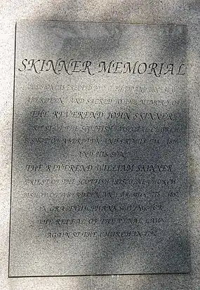He was born at Linshart, Longside, Aberdeenshire on 17 May 1744, the second son of the Reverend John Skinner, Incumbent of Lerwick and Grissel Hunter.[1][2] He was educated at Marischal College, Aberdeen; obtaining a Master of Arts degree in 1761.[1] He married in 1765 to Mary Robertson (1736–1807), and they had five sons and three daughters.[1] One of their sons, John (1769–1841), became Dean of Dunkeld and Dunblane, and another son, William (1778–1857), became Bishop of Aberdeen.[1]