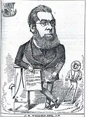 Cartoon, 1876. Wright's scroll lists his core political principles: "Free Trade; Ballot; Extended Suffrage; Religious Liberty; Progress". The footman in the background has the head of a button, in allusion to Wright's commercial roots.