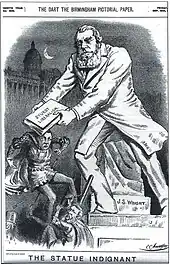 Cartoon of 1892 depicting Wright's statue beating Joseph Chamberlain with a volume marked "Sturdy Liberalism"