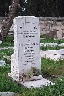 - ↑ "Rev. J. S. Grauel, 68, A Supporter of Israel". The New York Times. September 10, 1986. Retrieved August 28, 2018.. "The Rev. John Stanley Grauel, a Methodist minister who was an activist for the Jewish people and Israel, died Friday at his home in Roosevelt, N.J.", published on September 10, 1986
