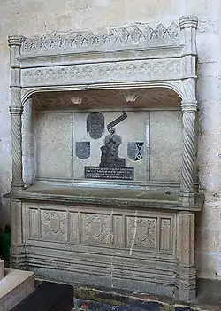 He was buried, and his monument was raised, in the presbytery north of the sanctuary (now forming the north aisle) in the magnificent surroundings of Milton Abbey church. The monument is an altar tomb of Purbeck marble, the chest, with quatrefoil panels enclosing plain shields, supported on a moulded plinth. Over this, supported forward on two barley-twist columns which rise into octagonal corner turrets, is a stone canopy with a frieze of quatrefoils with pierced foliate cresting above. The underside of the canopy is carved with ornamental tracery, with two pendants (as from a pendant vault) from which the finials are missing.[4][45]
