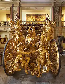 John's reign was characterized by a stressed importance of relations with Rome and the Papacy, though the state of relations with the Holy See largely depended on the pope at the time. John sought acknowledgement by the pope as a lawful and righteous monarch as a means of international recognition of his capabilities and authority. Relations with John's first pope, Clement XI, were largely successful, resulting from mutual beneficial agreements. In 1716, in response to a request by Pope Clement XI to John for aid in the fight against the Turks, the King sent an armada of Portuguese ships to assist Venice and Austria in their conflicts with the Turks that was led by his brother Infante Francisco, Duke of Beja, and Lopo Furtado de Mendonça, Count of Rio Grande.[48] In the same year, John ordered a formal, triumphal entry for his ambassador in Rome, Rodrigo Anes de Sá Almeida e Meneses, 3rd Marquis of Fontes.[49] Seeking to mimic the response received at the French court, 5,000 cruzados were spent on a luxurious entry for the Portuguese envoy.[50] The ceremonial procession included a convoy of 300 carriages surrounding the pièce de résistance of the procession, the Oceans Coach, an ornate carriage made in Lisbon to demonstrate the wealth of the Portuguese empire to Rome.[50] This impressed the papal court, and Pope Clement raised the dignity of the Archdiocese of Lisbon to the Patriarchate of Lisbon, making the Portuguese capital only one of two dioceses with this title in Europe, alongside Venice.[48] John's good fortune with the papacy and Italy would continue to raise the next year, in 1717, when the aid of a Portuguese squadron of ships helped win the Battle of Matapan, in the ongoing Ottoman-Venetian War.[51]