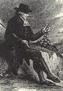 Walker's natural history lectures spanned the academic year and were divided into two sections. The first half of the year he gave his 'Hippocratean' lectures, that is, meteorology, hydrology and geology. The second half of the year was devoted to the three kingdoms of nature: minerals, plants, and animals. During the 1760s, he had accepted Linnaeus' binomial classification system and during his university tenure he readily applied it to botany. However, he did not agree with Linnaeus' classification of minerals and animals and therefore he developed his own unique system for both of these subjects. As shown by Matthew Daniel Eddy,[4] Walker developed a sophisticated theory of the earth based on evidence gathered from geochemistry and human history. Throughout his entire career he kept his ties with the Church of Scotland and in 1790 he was elected to be Moderator, its highest position. Sometime in the late 1790s he began to lose his sight and several of his lectures were taken over by Dr Robert Jameson, a physician and former student who had also studied in mainland Europe. By the time that he died in 1803, Walker had taught well over 800 students, some of whom would go on to have a significant impact on 19th-century natural history. Some of these names include Rev. Prof. John Playfair, Sir James Edward Smith, Sir James Hall, Mungo Park, Robert Waring Darwin, Robert Brown, Thomas Beddoes, Thomas Charles Hope, and Samuel Latham Mitchell.