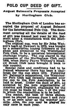 - ↑ "Polo Ponies Sail To-Day. Will Be Used in the International Match at Hurlingham. The Pick Of Six Stables. Twenty-four in All, Furnished by Gould, Mackay, Cowdin, Agassiz, and "Larry" Waterbury". New York Times. 11 January 1902. Retrieved 5 April 2011.