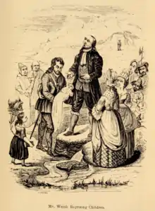 Welsh was among the first who decided to preach in the fields against law, indeed, he is credited with being the inventor of the field conventicles of the Covenanters. In January, 1666, he was proclaimed for this, along with Semple and Blackadder, by the Privy Council. "Particularly the said Mr John Welsh does presume frequently, at least once every week, to preach in the parish of Irongray in the Presbytery of Dumfries, and himself and those who frequent his conventicles do convene together armed with swords and pistols; at which meetings he also baptizes children which are brought to him by disaffected persons."[12][13]