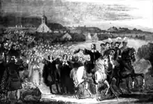 John Welsh was born, probably in 1624, son of Josias Welsh,[6] minister at Templepatrick, County Antrim, grandson of John Welsh of Ayr, and great-grandson of John Knox. He graduated with an M.A. from Glasgow University in 1647, and was admitted to Irongray on the Cluden Water, Dumfrieshire, on 21 January 1653.[7] At the instance of a heritor, David M'Brear of Newark and Almagill, M.P. for the Stewartry of Kirkcudbright, he was accused before the Privy Council, June 1662, of having called Middleton's Parliament "a drunken Parliament", but was acquitted since the witnesses' testimony did not agree.[8] Soon after the restoration of Episcopacy he was deprived. His congregation used force to prevent a new minister being settled.[9] The Privy Council imposed their will with increased force.[10] It was probably in February, 1663, that John Welsh was outed from Irongray. He seems to have sought refuge with John Neilson of Corsack, where other outed preachers, Gabriel Semple of Kirkpatrick-Durham and Blackadder of Troqueer also found shelter. Ejected ministers were forbidden to reside within twenty miles of their parishes, six miles of Edinburgh or any cathedral church, or three miles of any royal burgh. "Conditions which," as Wodrow remarks, " the nicest geographer would find hard to satisfy." They were pretty nearly satisfied in Welsh's case. At Corsack Welsh's first wife died. (Wodrow ii., 4, 5, 6, Veitch's Memoirs, Blackadder 24.) It was probably too at Corsack that Welsh penned his pamphlet, " Fifty and Two Directions to Irongray."[11]