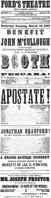On November 25, 1864, Booth performed for the only time with his brothers Edwin and Junius in a single engagement production of Julius Caesar at the Winter Garden Theatre in New York.[56] He played Mark Antony and his brother Edwin had the larger role of Brutus in a performance acclaimed as "the greatest theatrical event in New York history."[55] The proceeds went towards a statue of William Shakespeare for Central Park, which still stands today (2019).[56][57] In January 1865, he acted in Shakespeare's Romeo and Juliet in Washington, again garnering rave reviews. The National Intelligencer called Booth's Romeo "the most satisfactory of all renderings of that fine character," especially praising the death scene.[58] Booth made the final appearance of his acting career at Ford's on March 18, 1865, when he again played Duke Pescara in The Apostate.[59][60]