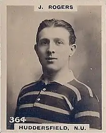 John Henry Rogers (1 October 1892[6] – 26 July 1958[7]) was a Welsh rugby union and professional rugby league footballer who played in the 1900s, 1910s and 1920s. He played club level rugby union (RU) for Bridgend RFC and Cardiff RFC,[1][2] initially as a wing, i.e. number 11 or 14, and later as a scrum-half (alongside Clem Lewis) and representative level rugby league (RL) for Great Britain, Wales and Other Nationalities, and at club level for Huddersfield and Wakefield Trinity (Heritage No. 313), as a wing, stand-off, or scrum-half, i.e. number 2 or 5, 6, or 7.[3][8][4]