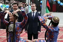 ![]() Russian President Dmitry Medvedev and Turkmen President Gurbanguly Berdymukhamedov at the opening of a new building in the school in December 2009. | |