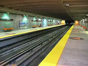 Designed by Claude Boucher, it is a side platform station, built in a shallow open cut, with the ticket hall integrated into a large glass-walled entrance pavilion. The design was influenced by the International Style architecture of Ludwig Mies van der Rohe.[5] The floor of the platform level is decorated with a series of 42 circular ceramics by the architect.[6]