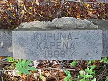 His funeral at Kawaiahaʻo Church was attended by friends, family, members of the Legislature, and the Chamberlain, who represented the King. The church was packed with mourners. The funeral service was conducted by Henry H. Parker, a reverend of Kawaiahaʻo Church, with assistance from George Washington Pilipō of Kaumakapili Church. Parker's discourse, which was in Hawaiian, gave a brief sketch of Kapena's life, and held him up as an example for his countrymen to follow. After the service, Kapena's coffin was placed in a newly constructed tomb or vault in the churchyard.[18][19][20] His grave marker reads "Kupuna Kapena 1868."[21] John Mākini Kapena and his wife Emma Aʻalailoa Malo Kapena were also buried in the Kapena family plot. Other relatives interred there include Umiuimi, David Kalu and Kahoihoi Pahu.[22]