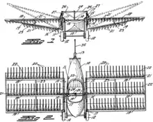 By 1931 there was still no working prototype, and Caldwell moved to Orangeburg, New York, and later to Madison, New Jersey.[3] A January 14, 1932 newsreel film shows the ornithopter being readied for a test. This was apparently attempted without success, by the otherwise unknown Emile Harrier. Additional funds were then raised by another stock issue in order to build a full-sized prototype at Teterboro Airport. He also apparently restarted his cyclogyro work, and an article appeared in one of the Popular Mechanics-like magazines showing the design equipped with a V-8 engine mounted in an odd twin-fuselage with the pilot and passengers below.