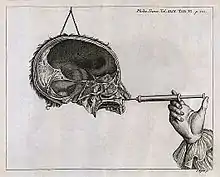 Jonathan presented a paper in 1755 to the Royal Society on a method of restoring hearing by using a catheter to clear a blocked eustachian tube (i.e., the canal that runs from the nose to the ear).[7] Although he made this presentation to the Society, he was never admitted there as a Fellow. However, he was elected a Fellow to the Society of Antiquaries of London.[8] Eventually, Jonathan and his brother established separate practices, with Jonathan ending up at Bond-court, in Walbrook, London, and Samuel at Great Cumberland Street in St. Marylebone.[6][9] In addition, Jonathan became a surgeon in 1770 at the London Magdalen Hospital, which was an institution to rehabilitate prostitutes,[10] and this may have been an extension of his earlier work at the Lying-in Hospital. Presumably he carried on his duties at these institutions in conjunction with his private practice.